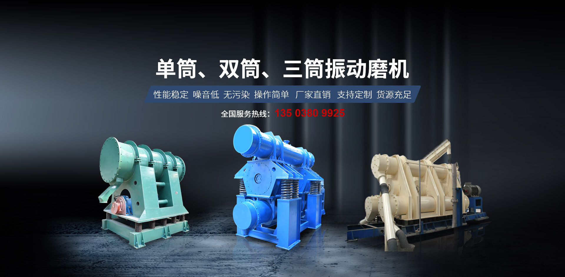 雙筒振動磨機產品有如下特點 :ZM型雙筒振動磨機是由驅動電機通過撓性聯軸節帶動激振器旋轉,產生足夠的激振力,使磨機機體進入環行周期振動狀態。振擺沖力被連續傳遞到裝入磨筒內的全部裝料上(磨破介質和受磨物料),通過磨破介質與受磨物料之間的互相沖擊,把受磨物料振動磨碎。